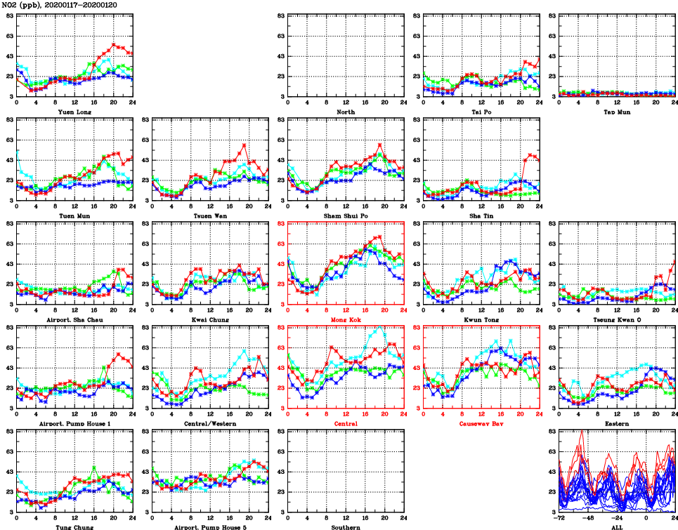 | Air Quality Data Time Series for NO2 (2020/01/20) | ( Line colors: Day -3 Day -2 Day -1 Current day ) | 2D Map Current AQHI |