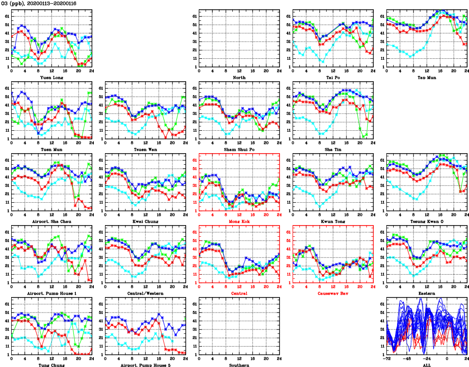 | Air Quality Data Time Series for O3 (2020/01/16) | ( Line colors: Day -3 Day -2 Day -1 Current day ) | 2D Map Current AQHI |