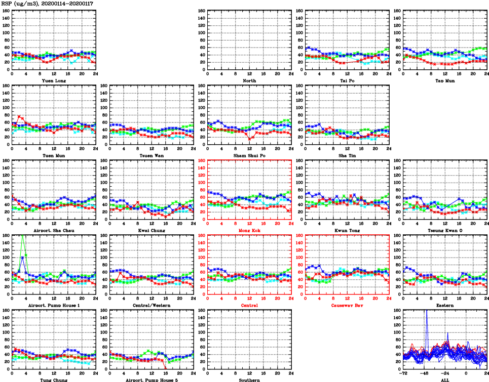 | Air Quality Data Time Series for RSP (2020/01/17) | ( Line colors: Day -3 Day -2 Day -1 Current day ) | 2D Map Current AQHI |