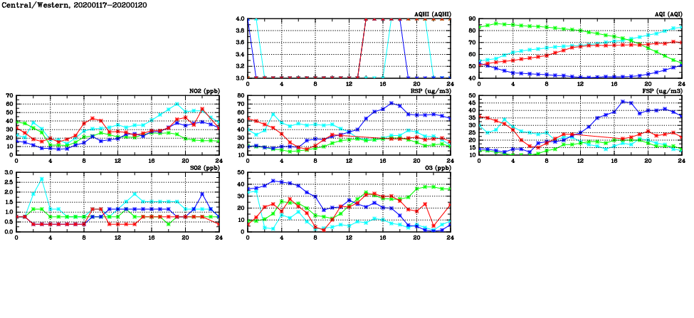 | Air Quality Data Time Series in Central/Western (2020/01/20) | ( Line colors: Day -3 Day -2 Day -1 Current day ) | 2D Map Current AQHI |