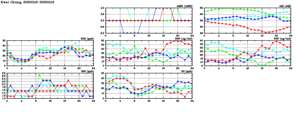 | Air Quality Data Time Series in Kwai Chung (2020/01/19) | ( Line colors: Day -3 Day -2 Day -1 Current day ) | 2D Map Current AQHI |