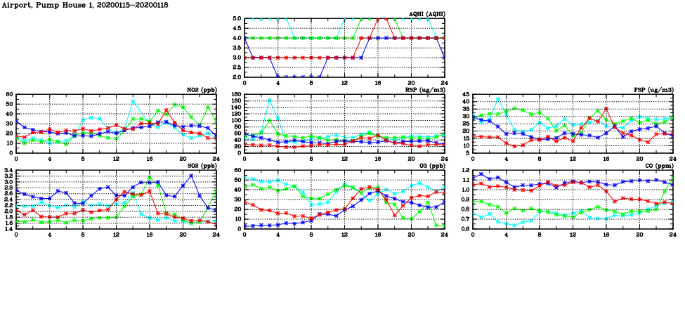 | Air Quality Data Time Series in Airport, Pump House 1 (2020/01/18) | ( Line colors: Day -3 Day -2 Day -1 Current day ) | 2D Map Current AQHI |