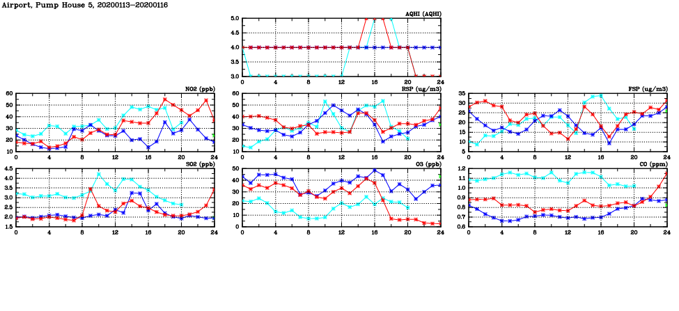 | Air Quality Data Time Series in Airport, Pump House 5 (2020/01/16) | ( Line colors: Day -3 Day -2 Day -1 Current day ) | 2D Map Current AQHI |