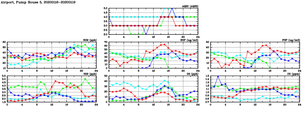 | Air Quality Data Time Series in Airport, Pump House 5 (2020/01/19) | ( Line colors: Day -3 Day -2 Day -1 Current day ) | 2D Map Current AQHI |