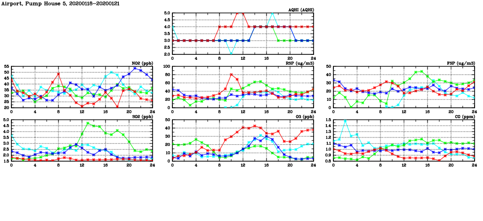 | Air Quality Data Time Series in Airport, Pump House 5 (2020/01/21) | ( Line colors: Day -3 Day -2 Day -1 Current day ) | 2D Map Current AQHI |