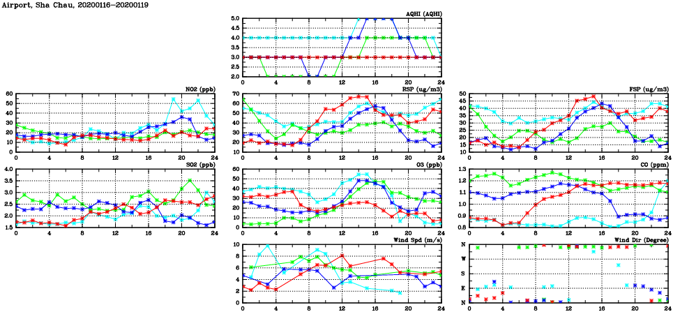 | Air Quality Data Time Series in Airport, Sha Chau (2020/01/19) | ( Line colors: Day -3 Day -2 Day -1 Current day ) | 2D Map Current AQHI |