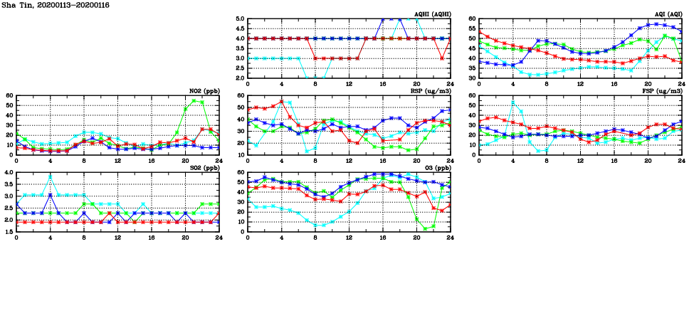 | Air Quality Data Time Series in Sha Tin (2020/01/16) | ( Line colors: Day -3 Day -2 Day -1 Current day ) | 2D Map Current AQHI |