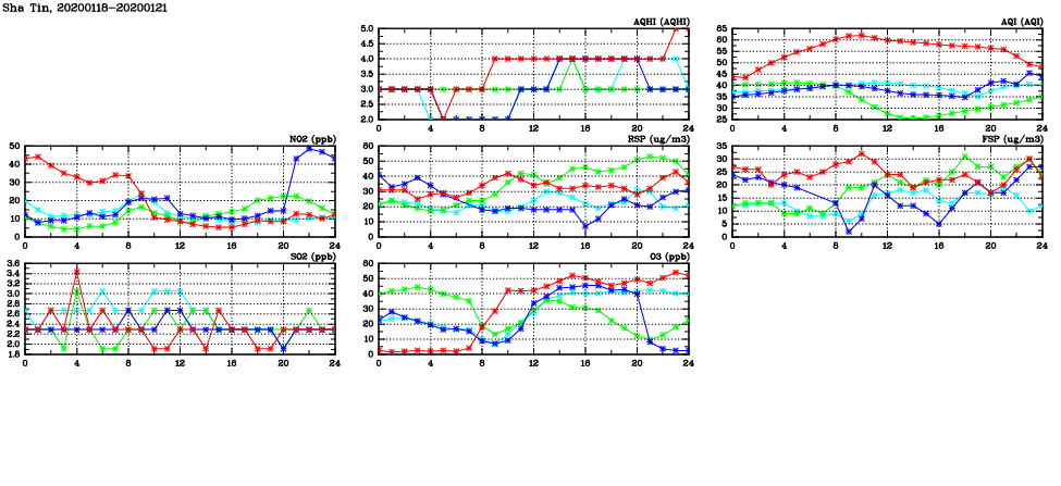 | Air Quality Data Time Series in Sha Tin (2020/01/21) | ( Line colors: Day -3 Day -2 Day -1 Current day ) | 2D Map Current AQHI |