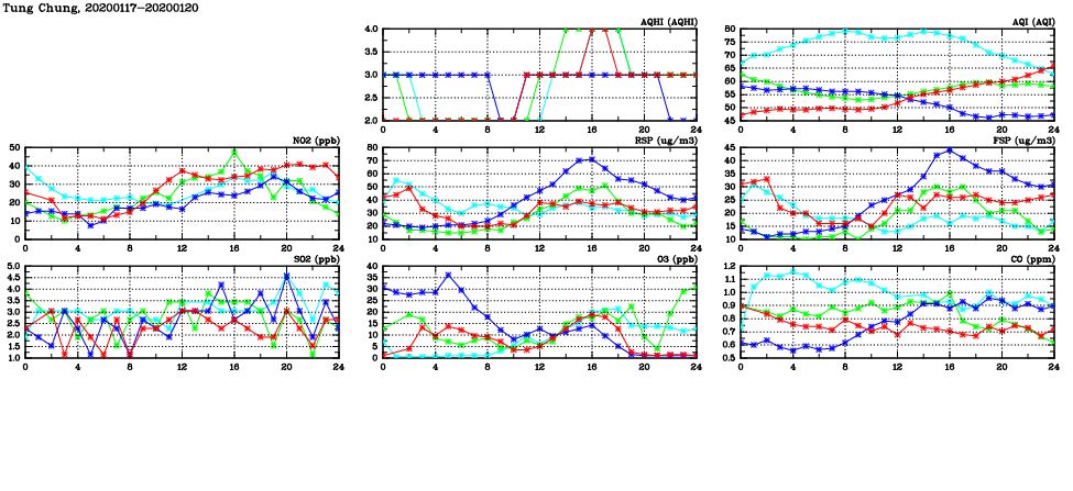 | Air Quality Data Time Series in Tung Chung (2020/01/20) | ( Line colors: Day -3 Day -2 Day -1 Current day ) | 2D Map Current AQHI |