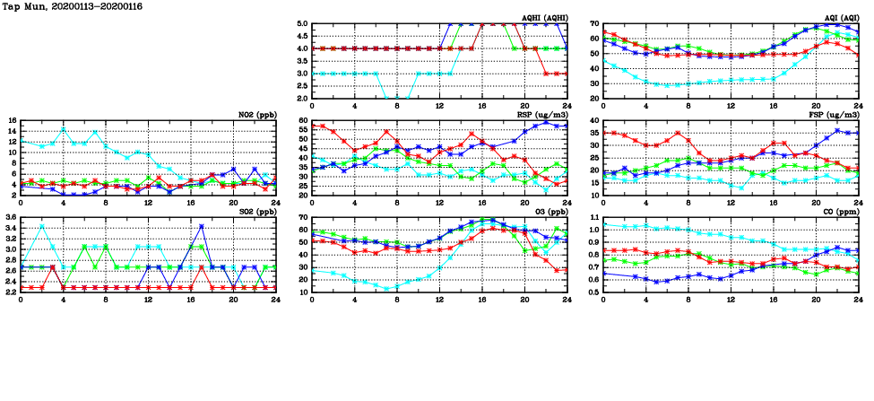 | Air Quality Data Time Series in Tap Mun (2020/01/16) | ( Line colors: Day -3 Day -2 Day -1 Current day ) | 2D Map Current AQHI |