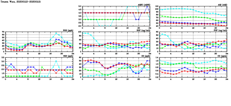 | Air Quality Data Time Series in Tsuen Wan (2020/01/15) | ( Line colors: Day -3 Day -2 Day -1 Current day ) | 2D Map Current AQHI |