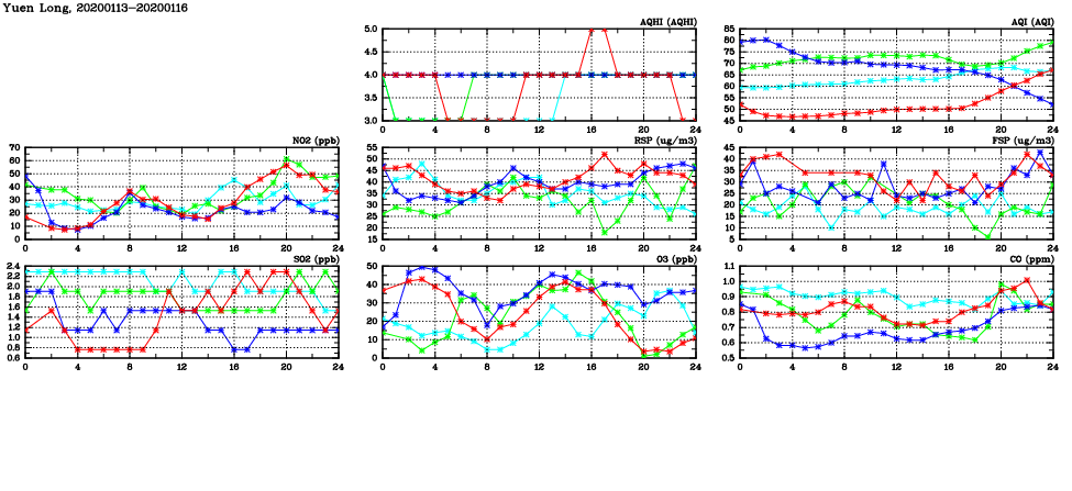 | Air Quality Data Time Series in Yuen Long (2020/01/16) | ( Line colors: Day -3 Day -2 Day -1 Current day ) | 2D Map Current AQHI |
