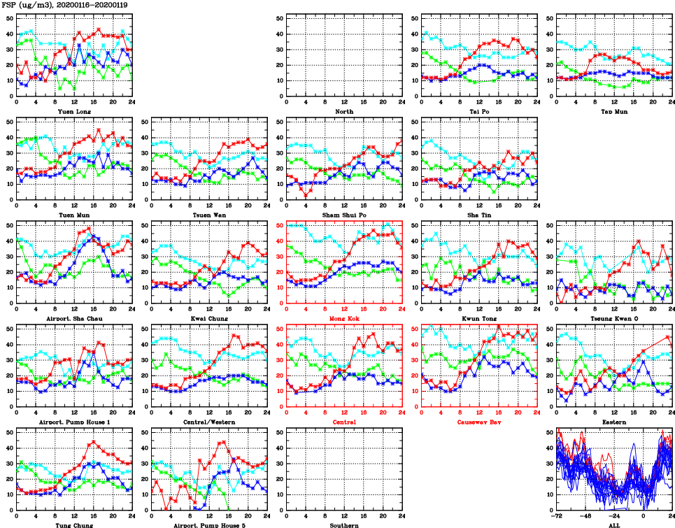 | Air Quality Data Time Series for FSP (2020/01/19) | ( Line colors: Day -3 Day -2 Day -1 Current day ) | 2D Map Current AQHI |