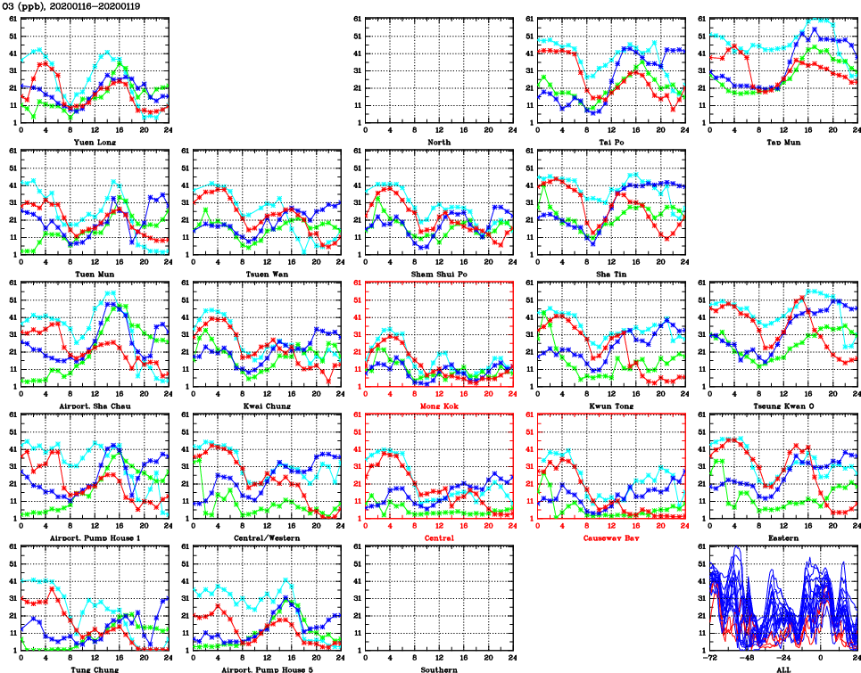 | Air Quality Data Time Series for O3 (2020/01/19) | ( Line colors: Day -3 Day -2 Day -1 Current day ) | 2D Map Current AQHI |