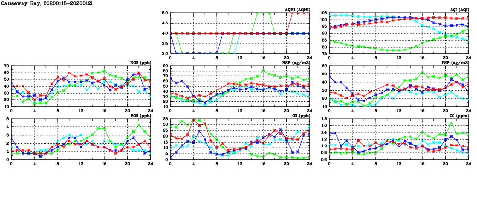 | Air Quality Data Time Series in Causeway Bay (2020/01/21) | ( Line colors: Day -3 Day -2 Day -1 Current day ) | 2D Map Current AQHI |
