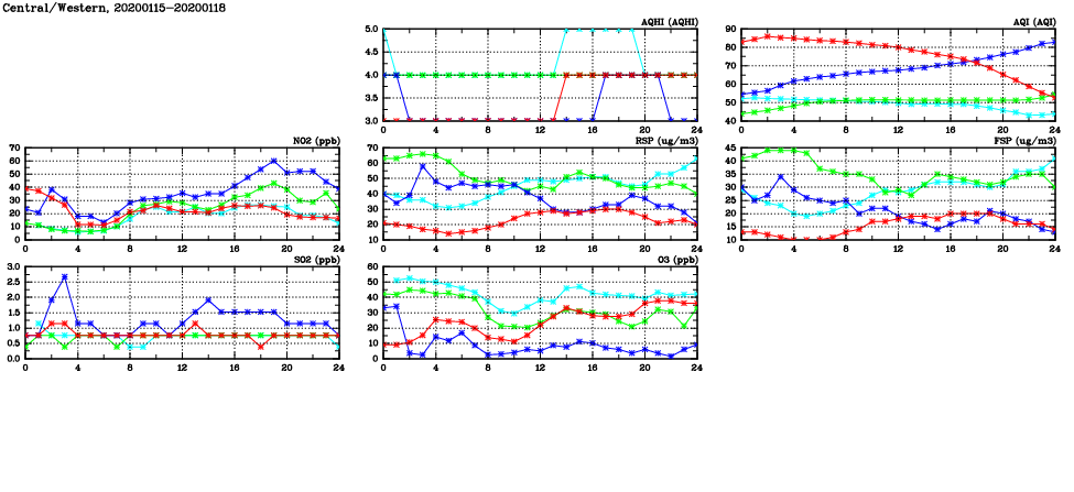 | Air Quality Data Time Series in Central/Western (2020/01/18) | ( Line colors: Day -3 Day -2 Day -1 Current day ) | 2D Map Current AQHI |