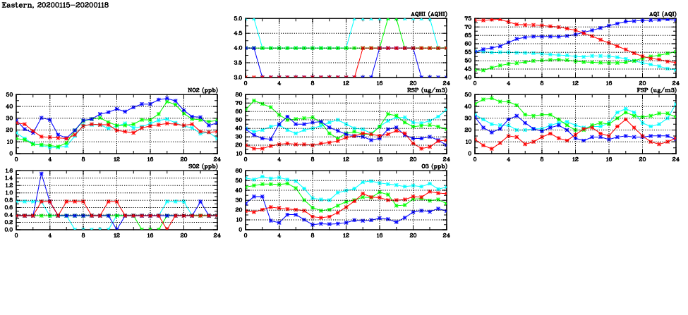 | Air Quality Data Time Series in Eastern (2020/01/18) | ( Line colors: Day -3 Day -2 Day -1 Current day ) | 2D Map Current AQHI |