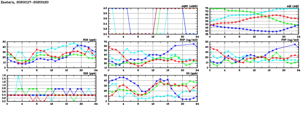 | Air Quality Data Time Series in Eastern (2020/01/20) | ( Line colors: Day -3 Day -2 Day -1 Current day ) | 2D Map Current AQHI |