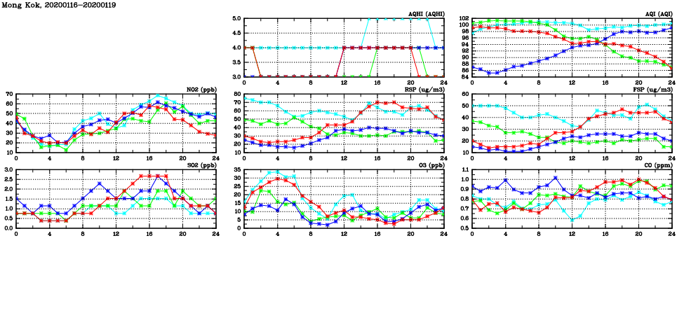 | Air Quality Data Time Series in Mong Kok (2020/01/19) | ( Line colors: Day -3 Day -2 Day -1 Current day ) | 2D Map Current AQHI |