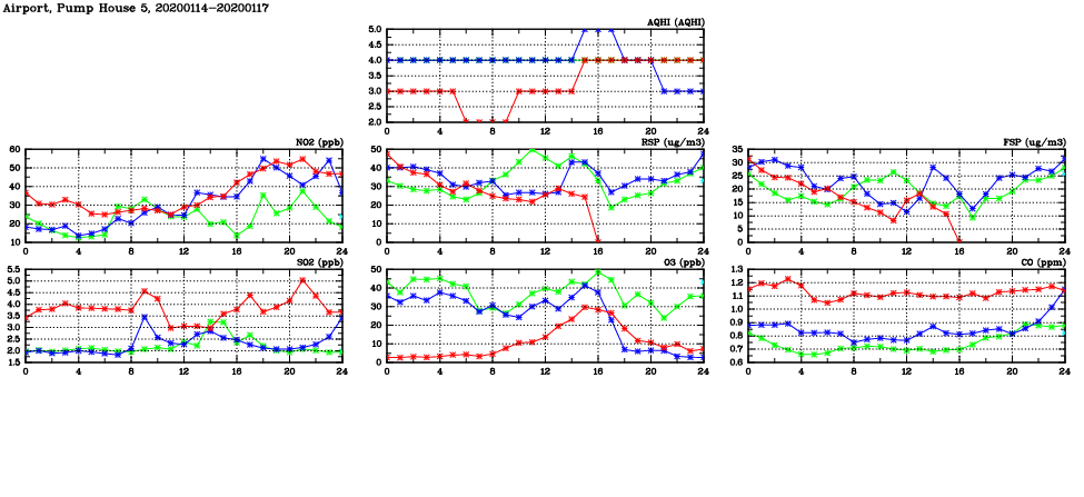 | Air Quality Data Time Series in Airport, Pump House 5 (2020/01/17) | ( Line colors: Day -3 Day -2 Day -1 Current day ) | 2D Map Current AQHI |