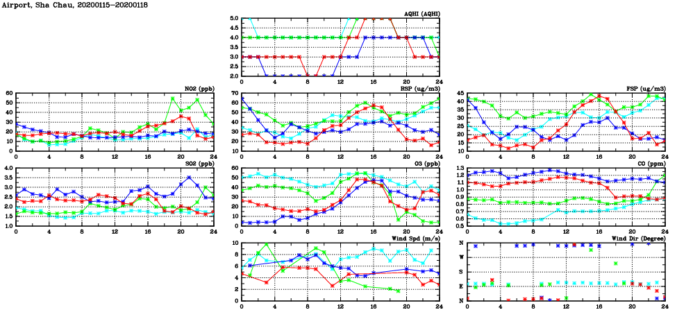 | Air Quality Data Time Series in Airport, Sha Chau (2020/01/18) | ( Line colors: Day -3 Day -2 Day -1 Current day ) | 2D Map Current AQHI |