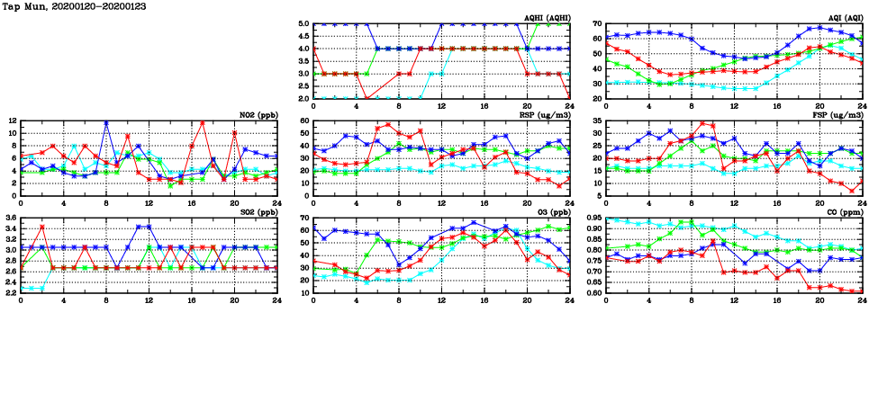 | Air Quality Data Time Series in Tap Mun (2020/01/23) | ( Line colors: Day -3 Day -2 Day -1 Current day ) | 2D Map Current AQHI |