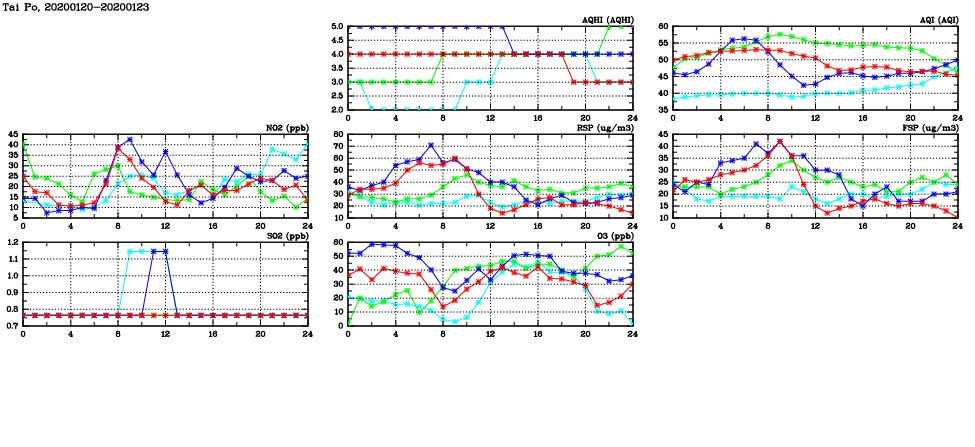 | Air Quality Data Time Series in Tai Po (2020/01/23) | ( Line colors: Day -3 Day -2 Day -1 Current day ) | 2D Map Current AQHI |