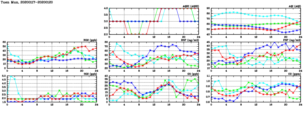 | Air Quality Data Time Series in Tuen Mun (2020/01/20) | ( Line colors: Day -3 Day -2 Day -1 Current day ) | 2D Map Current AQHI |
