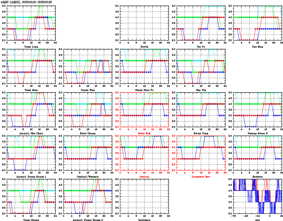 | Air Quality Data Time Series for AQHI (2020/01/18) | ( Line colors: Day -3 Day -2 Day -1 Current day ) | 2D Map Current AQHI |