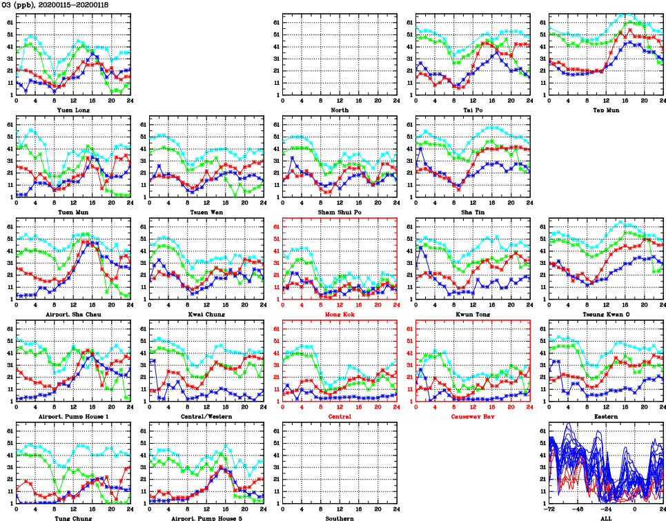 | Air Quality Data Time Series for O3 (2020/01/18) | ( Line colors: Day -3 Day -2 Day -1 Current day ) | 2D Map Current AQHI |
