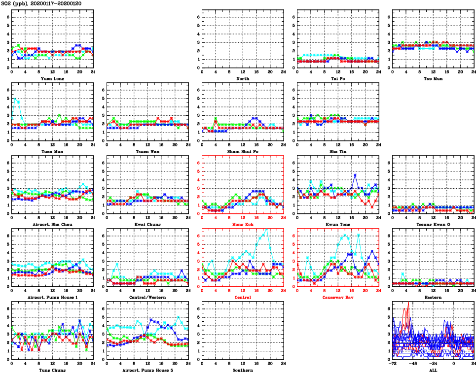 | Air Quality Data Time Series for SO2 (2020/01/20) | ( Line colors: Day -3 Day -2 Day -1 Current day ) | 2D Map Current AQHI |