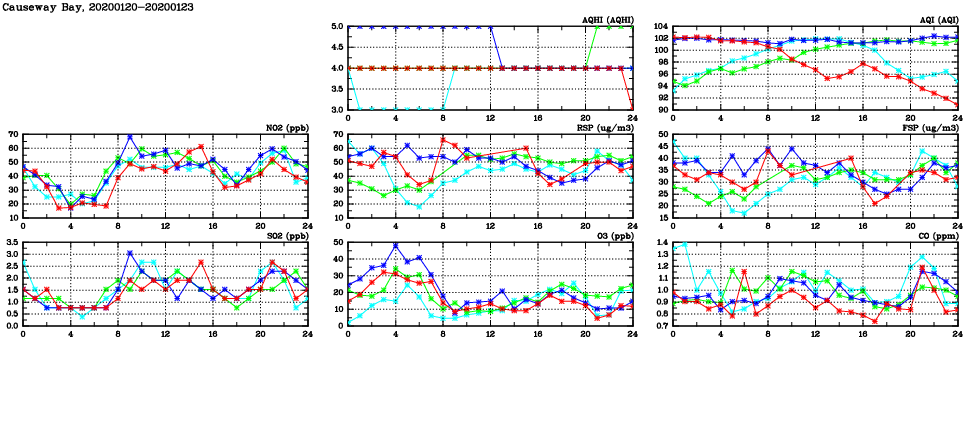 | Air Quality Data Time Series in Causeway Bay (2020/01/23) | ( Line colors: Day -3 Day -2 Day -1 Current day ) | 2D Map Current AQHI |