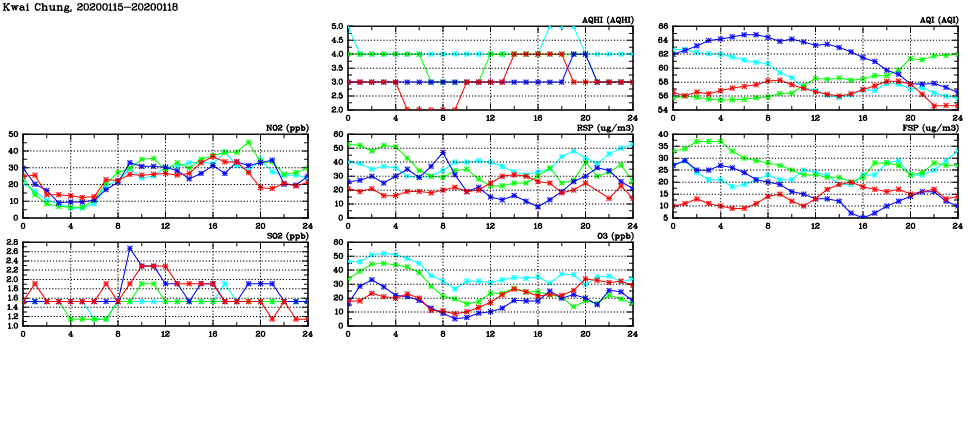 | Air Quality Data Time Series in Kwai Chung (2020/01/18) | ( Line colors: Day -3 Day -2 Day -1 Current day ) | 2D Map Current AQHI |
