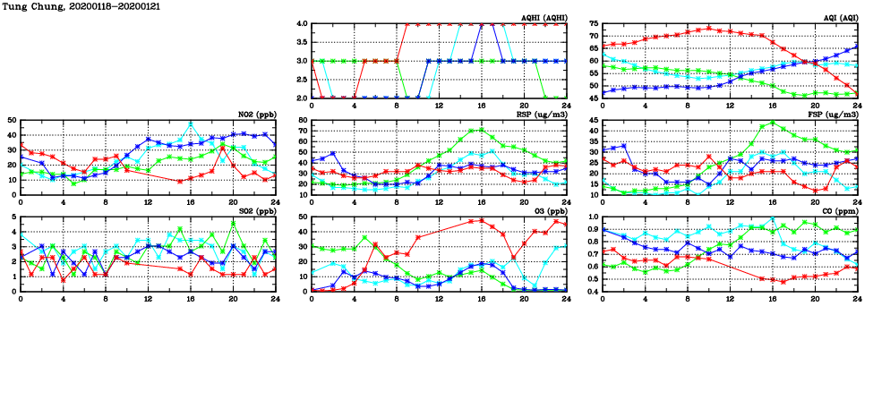 | Air Quality Data Time Series in Tung Chung (2020/01/21) | ( Line colors: Day -3 Day -2 Day -1 Current day ) | 2D Map Current AQHI |