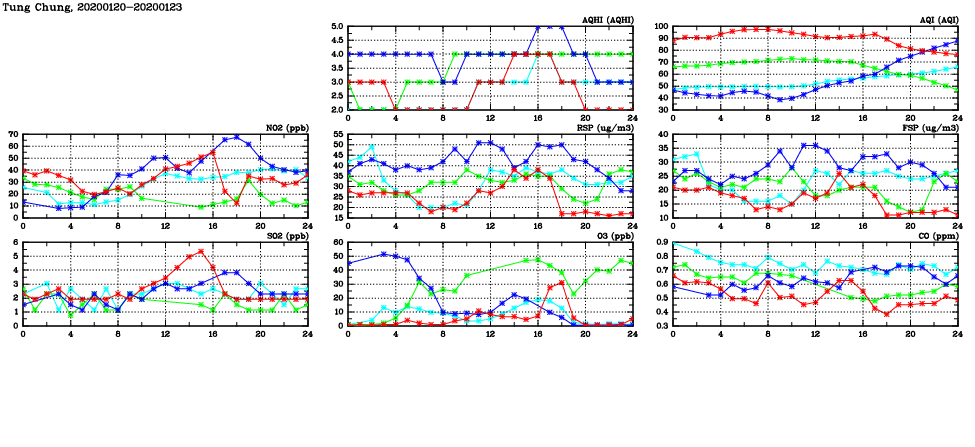 | Air Quality Data Time Series in Tung Chung (2020/01/23) | ( Line colors: Day -3 Day -2 Day -1 Current day ) | 2D Map Current AQHI |