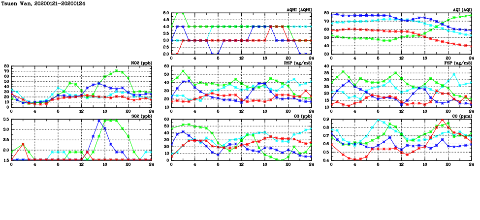 | Air Quality Data Time Series in Tsuen Wan (2020/01/24) | ( Line colors: Day -3 Day -2 Day -1 Current day ) | 2D Map Current AQHI |