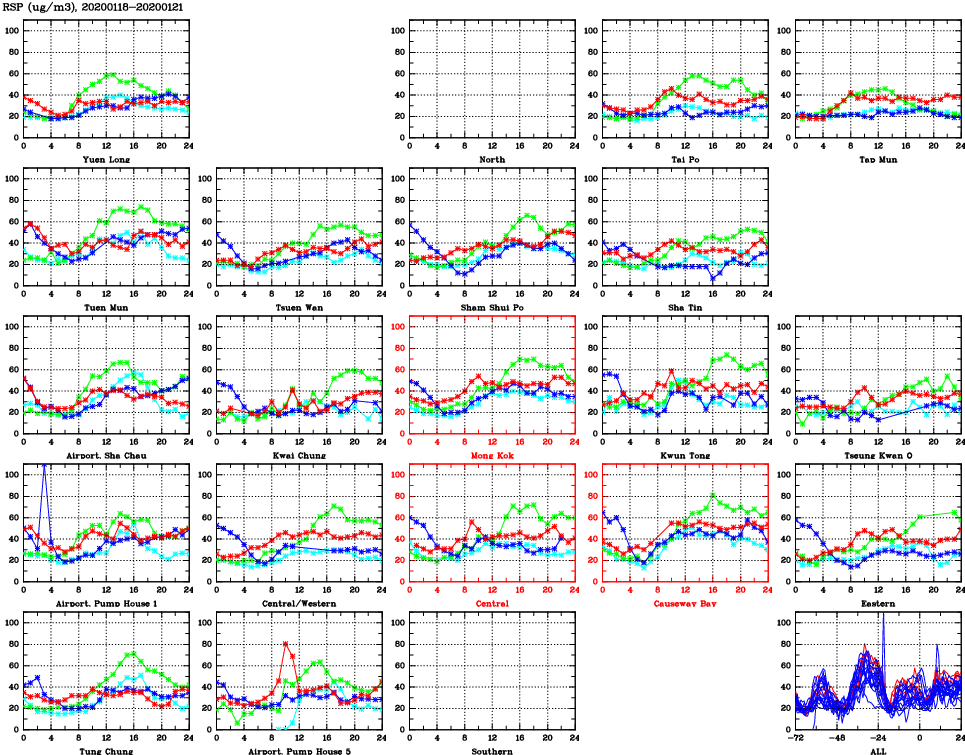 | Air Quality Data Time Series for RSP (2020/01/21) | ( Line colors: Day -3 Day -2 Day -1 Current day ) | 2D Map Current AQHI |