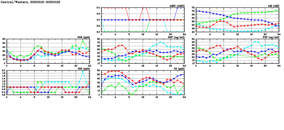 | Air Quality Data Time Series in Central/Western (2020/01/22) | ( Line colors: Day -3 Day -2 Day -1 Current day ) | 2D Map Current AQHI |