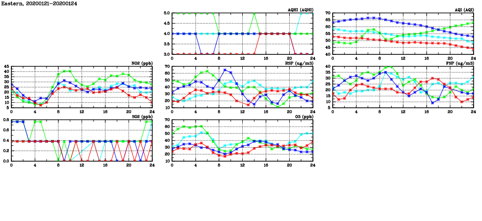 | Air Quality Data Time Series in Eastern (2020/01/24) | ( Line colors: Day -3 Day -2 Day -1 Current day ) | 2D Map Current AQHI |