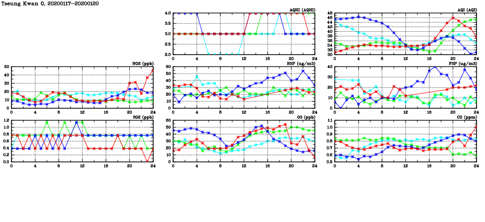 | Air Quality Data Time Series in Tseung Kwan O (2020/01/20) | ( Line colors: Day -3 Day -2 Day -1 Current day ) | 2D Map Current AQHI |