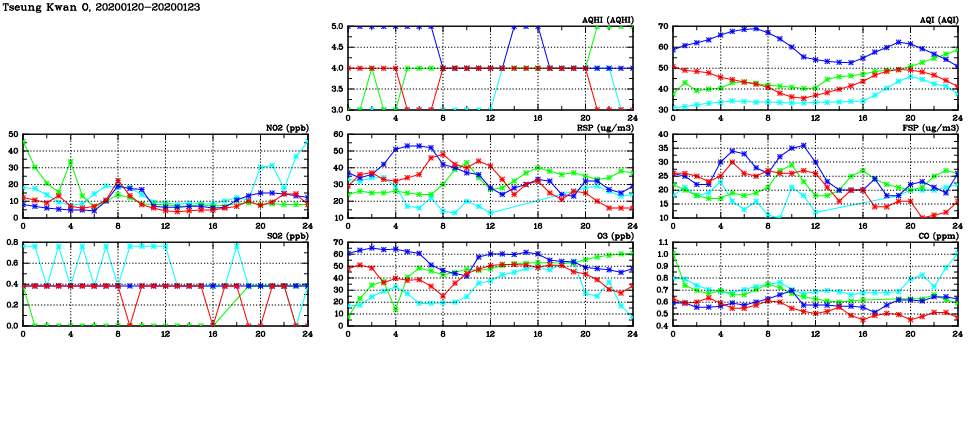 | Air Quality Data Time Series in Tseung Kwan O (2020/01/23) | ( Line colors: Day -3 Day -2 Day -1 Current day ) | 2D Map Current AQHI |