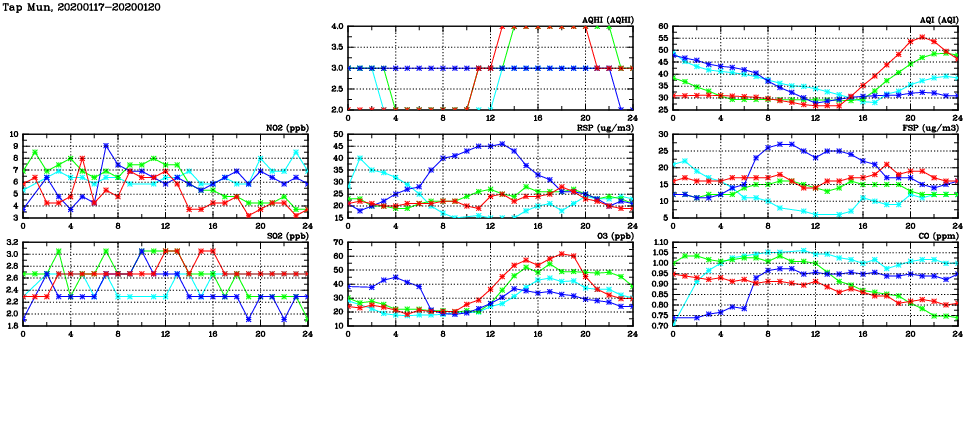 | Air Quality Data Time Series in Tap Mun (2020/01/20) | ( Line colors: Day -3 Day -2 Day -1 Current day ) | 2D Map Current AQHI |