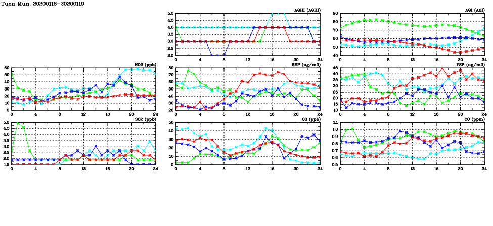 | Air Quality Data Time Series in Tuen Mun (2020/01/19) | ( Line colors: Day -3 Day -2 Day -1 Current day ) | 2D Map Current AQHI |