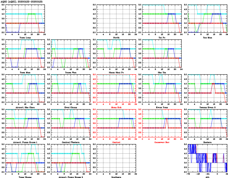 | Air Quality Data Time Series for AQHI (2020/01/25) | ( Line colors: Day -3 Day -2 Day -1 Current day ) | 2D Map Current AQHI |