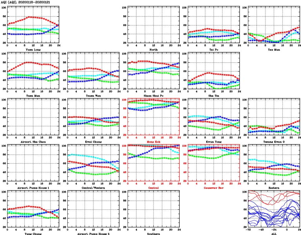 | Air Quality Data Time Series for AQI (2020/01/21) | ( Line colors: Day -3 Day -2 Day -1 Current day ) | 2D Map Current AQHI |
