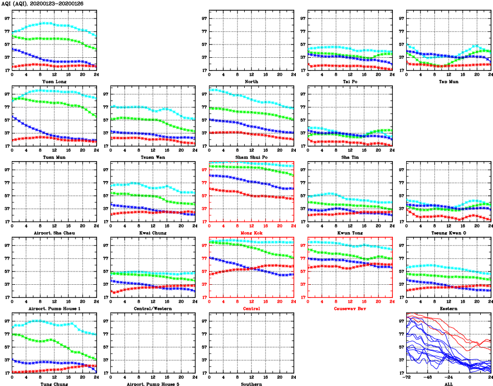 | Air Quality Data Time Series for AQI (2020/01/26) | ( Line colors: Day -3 Day -2 Day -1 Current day ) | 2D Map Current AQHI |