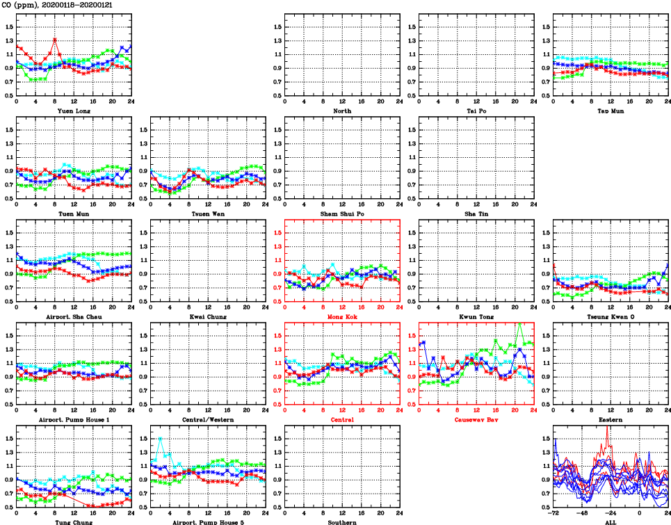 | Air Quality Data Time Series for CO (2020/01/21) | ( Line colors: Day -3 Day -2 Day -1 Current day ) | 2D Map Current AQHI |