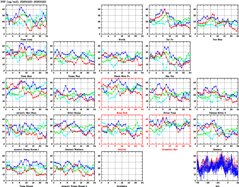 | Air Quality Data Time Series for FSP (2020/01/23) | ( Line colors: Day -3 Day -2 Day -1 Current day ) | 2D Map Current AQHI |