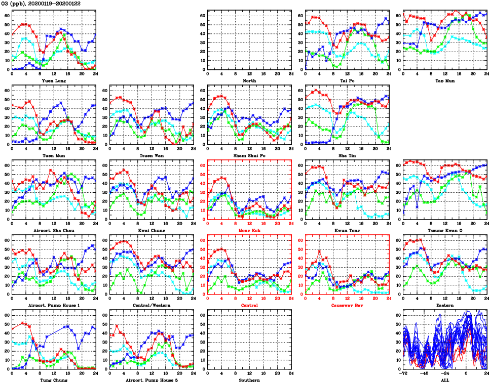 | Air Quality Data Time Series for O3 (2020/01/22) | ( Line colors: Day -3 Day -2 Day -1 Current day ) | 2D Map Current AQHI |
