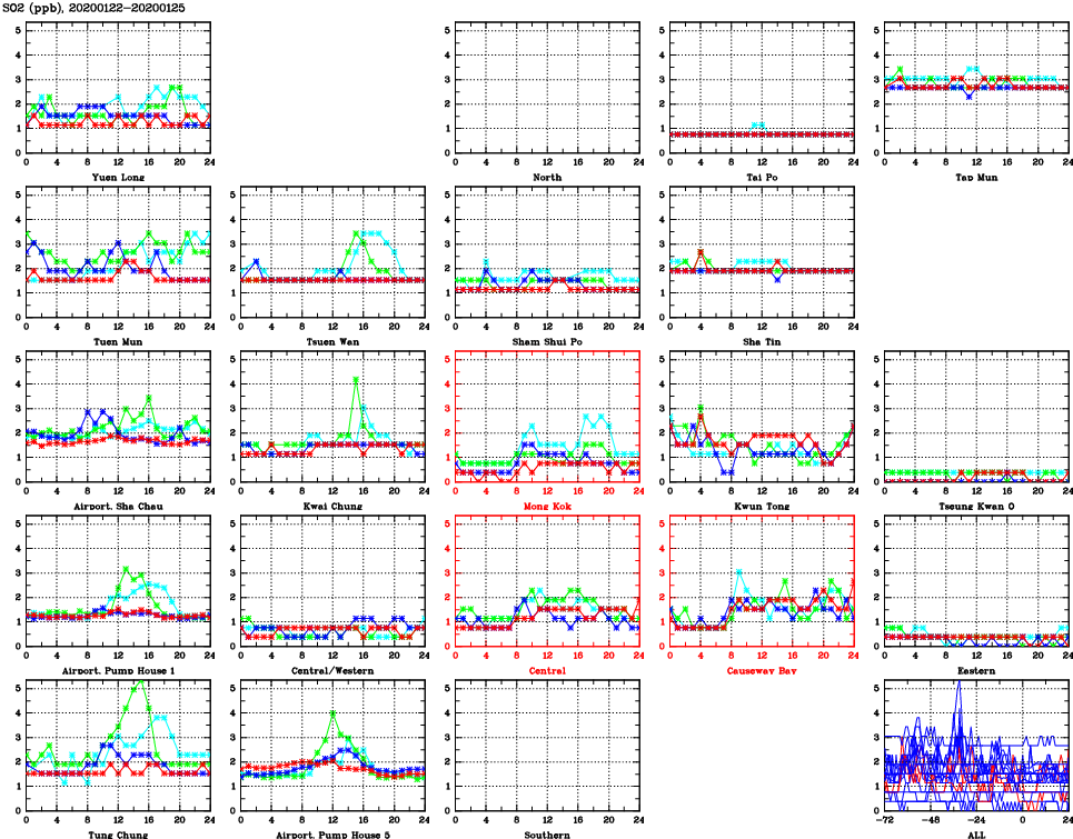| Air Quality Data Time Series for SO2 (2020/01/25) | ( Line colors: Day -3 Day -2 Day -1 Current day ) | 2D Map Current AQHI |